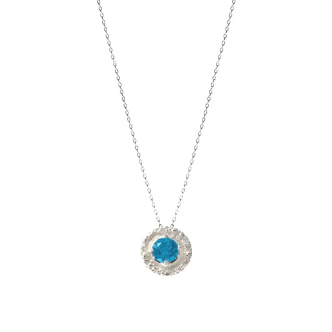 A round cut stone of your choice - either a vibrant Peridot or serene Swiss Blue Topaz - takes centre stage within a captivating, melting-effect circle of sterling silver. This pendant captures the unique and handmade nature of all Simon Pure designs.